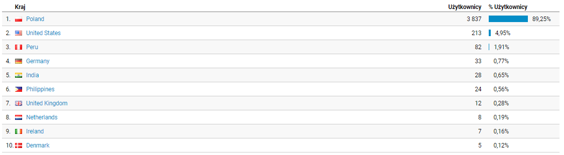 Zdecydowana większość Czytelników to osoby z Polski co mnie akurat nie dziwi. Zastanawiam się jednak skąd się wzięły w tym zestawieniu osoby z takich krajów jak Peru czy Indie? Czyżby moje wpisy cieszyły się zainteresowaniem również w tych krajach ;)?