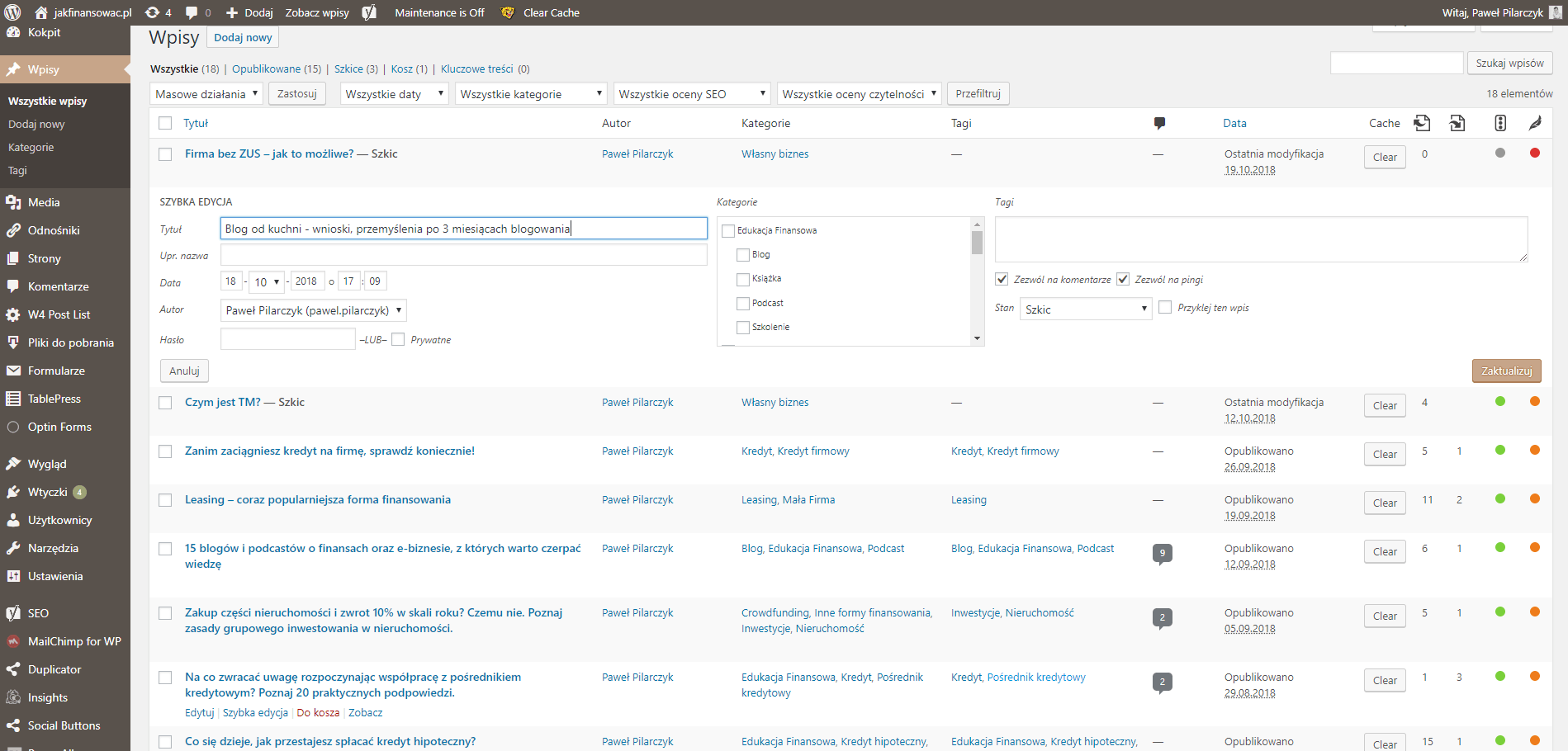 2. Następnym etapem było uruchomienie platformy technologicznej do obsługi bloga – WordPress.Tam edytuję artykuły, wstawiam grafiki, filmy, linki, nanoszę korekty i robię jeszcze wiele innych czynności. To moje podstawowe narzędzie pracy blogowej.Wordpress - zrzut ekranu
