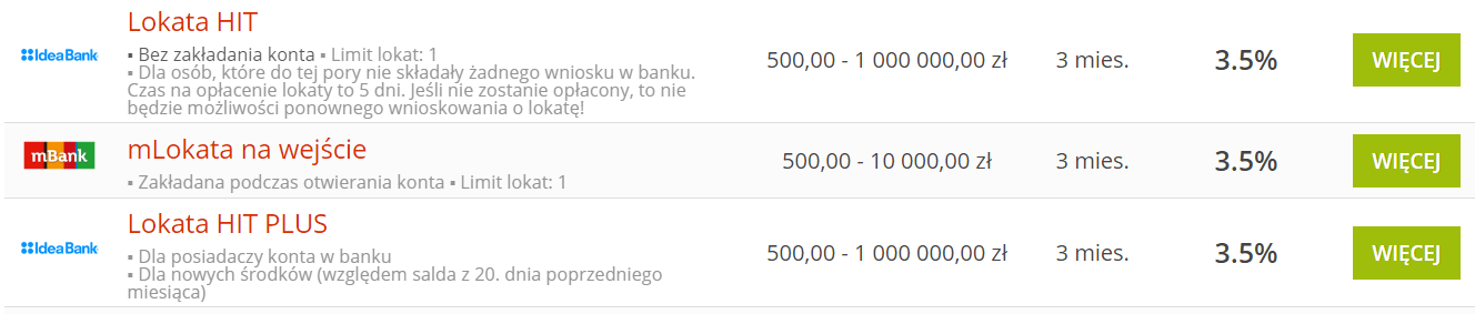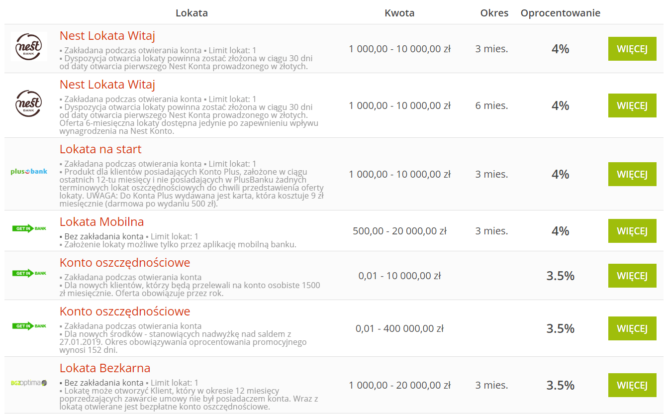 Poniżej znajdziesz przykład 10-ciu lokat z najwyższym oprocentowaniem na dzień 06.02.2019 r z wersji roboczej porównywarki finansowej.