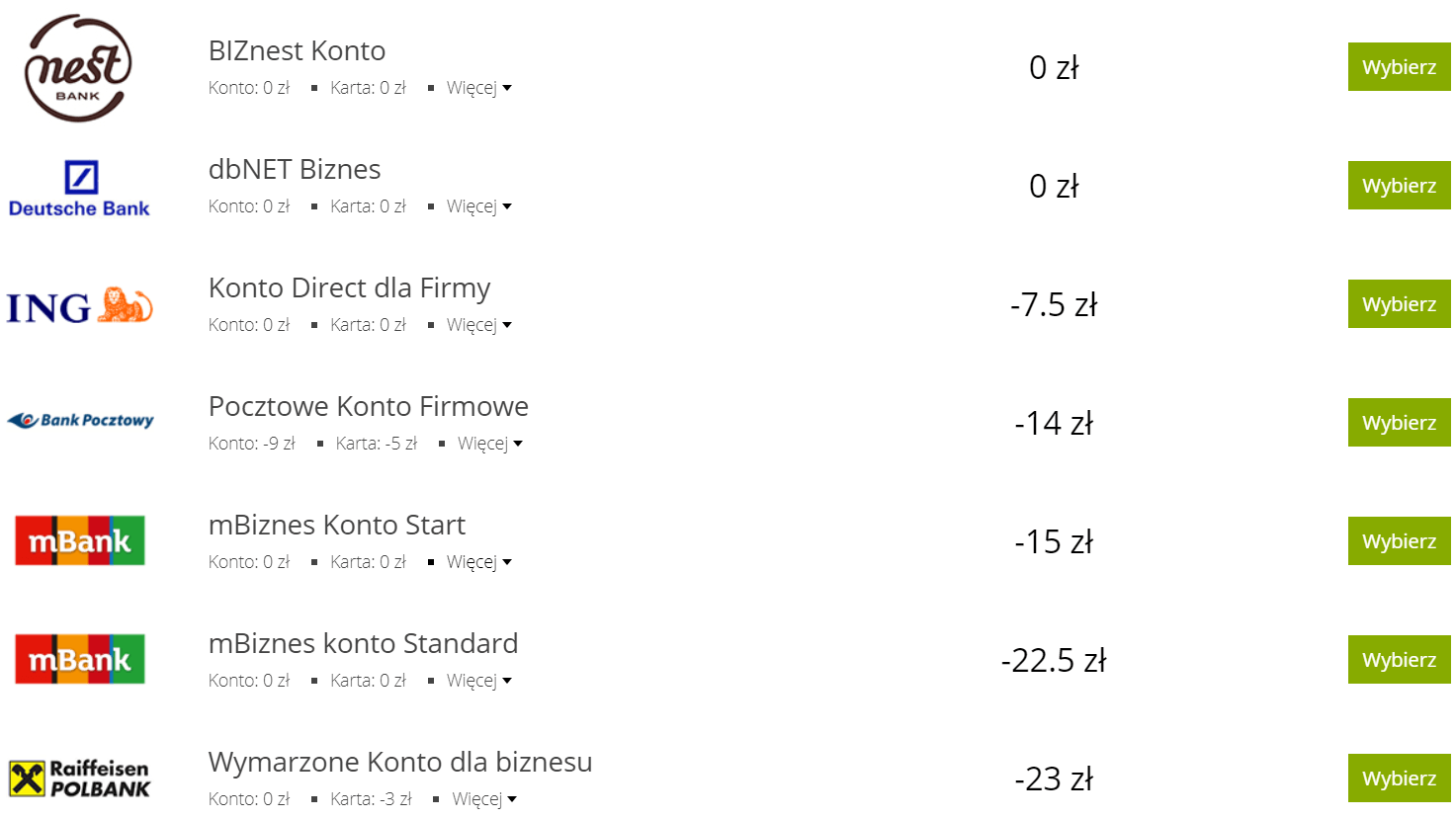 W przypadku kont osobistych i firmowych będziesz mieć możliwość dopasowania rachunku do swoich potrzeb, według wielu kryteriów. Przykładowy ranking kont firmowych według stanu na 06.02.2019 r znajdziesz na poniższej ilustracji.